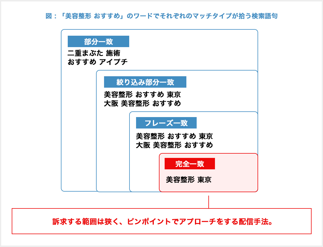 完全一致は、訴求する範囲は狭く、ピンポイントに活用するマッチタイプです。