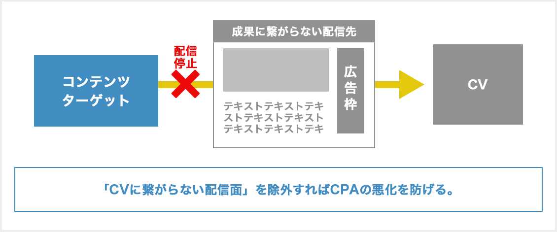 つまりコンテンツターゲットの仕組み上、キーワード選定を適切に行っても、不要な配信面での広告表示は避けれません。だから除外作業が大切なのです。このプロセスを通すことで、CPAの高騰を防げるわけです。