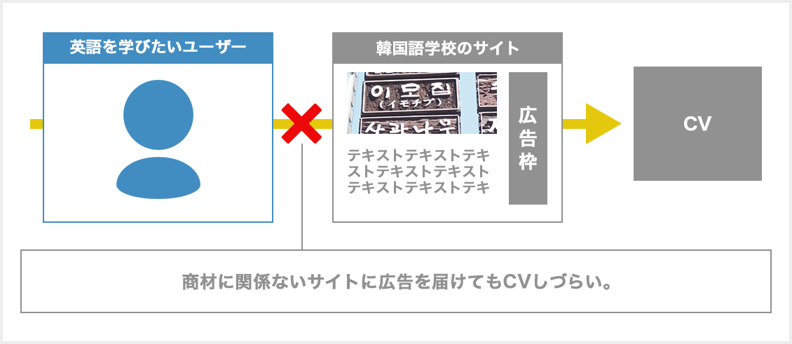 まずはコンテンツターゲットで「英会話」のキーワードを設定。しかし、韓国語学校のサイトに「英会話」の文字が含まれていれば、広告が表示されてしまいます。この場合CVは起きるでしょうか?