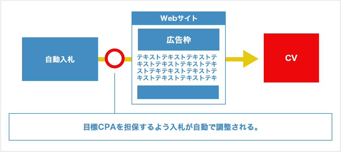成果の良い配信面には強気に入札したいもの。逆に、CVを見込めないなら弱めに配信したいですね。簡単に言うと、目標コンバージョンならこのプロセスを実現できるわけです。