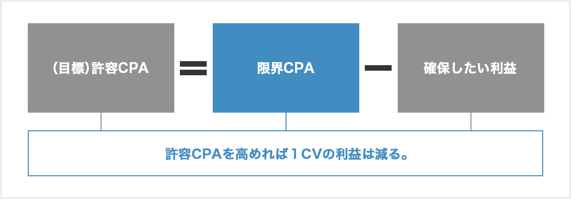 前述までの内容はあくまで限界CPAについて。この値ギリギリで運用すると利益が出ません。なので実際は限界CPAから「確保したい利益」を引いた金額を基準にする。この値が目標CPAです。下図の通りですね。