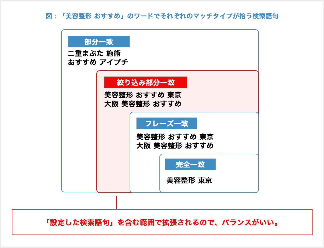 部分一致と適切に組み合わせて配信することで、より成果を見込めます。